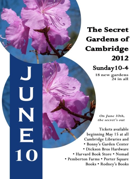 The Secret Gardens of Cambridge Tour will be held this Sunday June 10th, 2012 from 10am to 4pm. Tickets are on sale at all Cambridge public library branches, as well as select local stores. For details please visit the Cambridge Public Library website. This event only occurs every other year, so take advantage!
