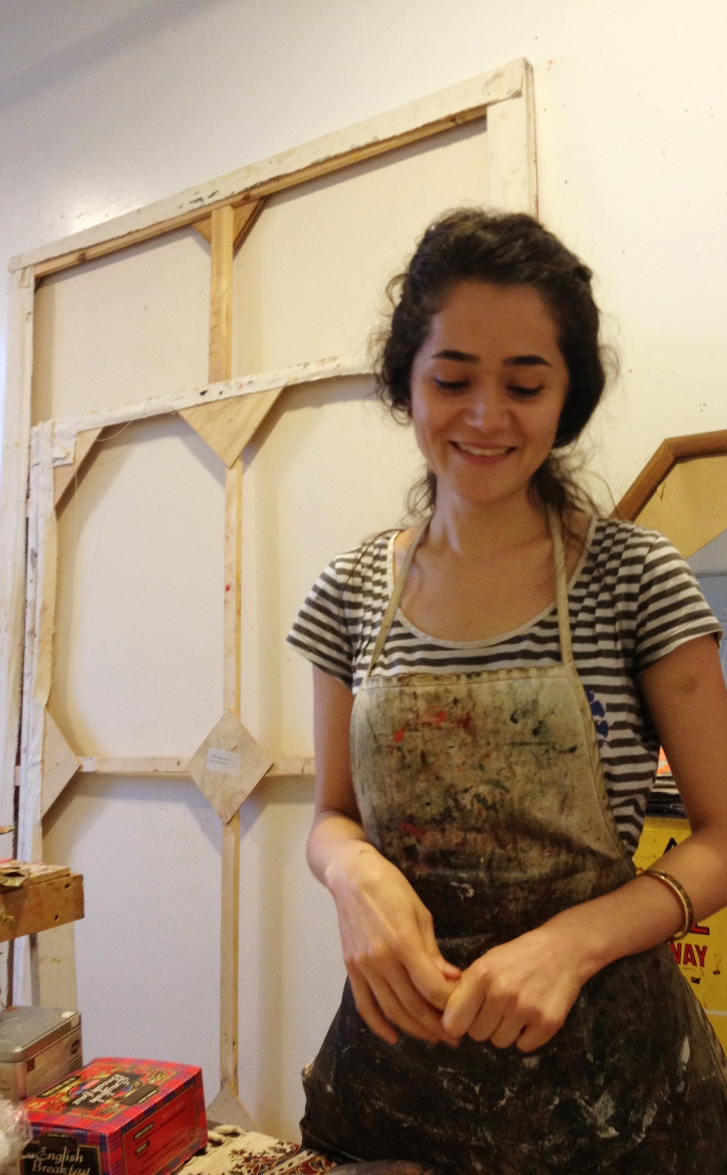 “I really love working with details. You know I’m from Iran, and if you pay attention to Persian art, Persian miniatures, the work is really detailed.” Laid over the painted canvas are small strips of fabric, which, from a distance, add a rich depth to the paint, and, as you notice these details, they draw you ever closer to the canvas.“I want the viewer to come close to my paintings. To look at my paintings.”