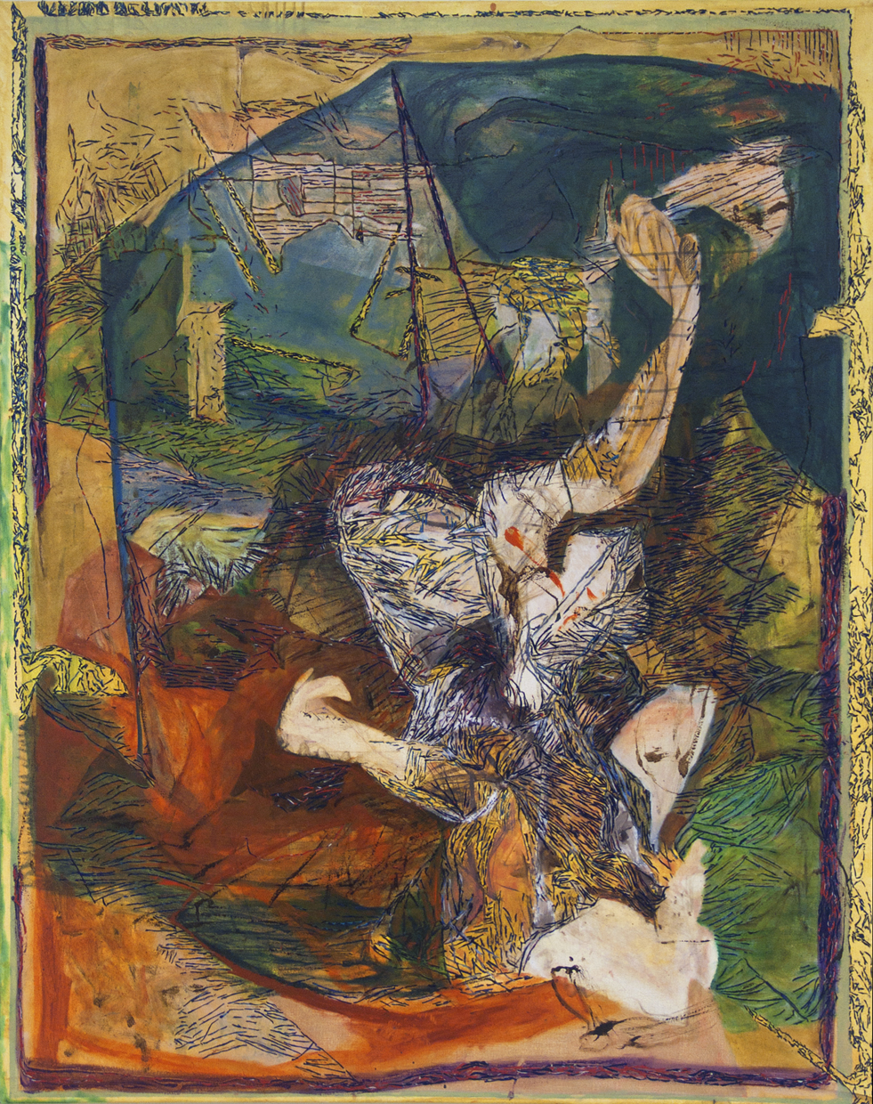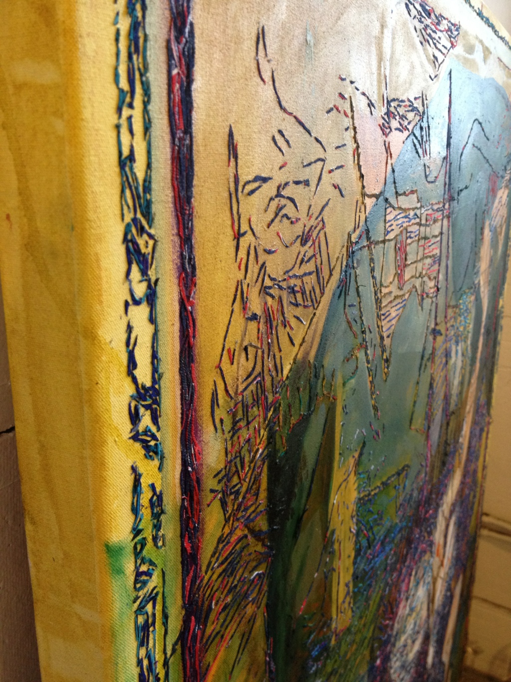 Amigh cuts fabric into fine slivers, a process that she finds helps her “travel into the presence of my inner self.” The process of using small pieces of cloth and gluing them onto the canvas helps her create a tactile quality that reinforces the relationship of the painting. “To me cutting fabric in small pieces is a really good response to my anxiety. I am making my world in my paintings.