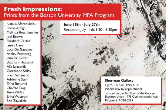 Her work is currently on display at the Sherman Gallery as part of the “Fresh Impressions” exhibit. The exhibit runs until July 27th.