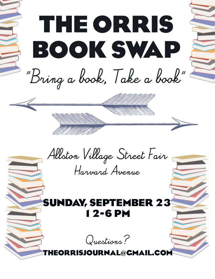 The Orris is hosting a book swap at The Allston Village Street Fair this Sunday, September 23 from 12-6. The Allston Village Street Fair is an all-ages, free event featuring live music, multicultural street performances, an artist market, vendors, an international food court, and community organizations.